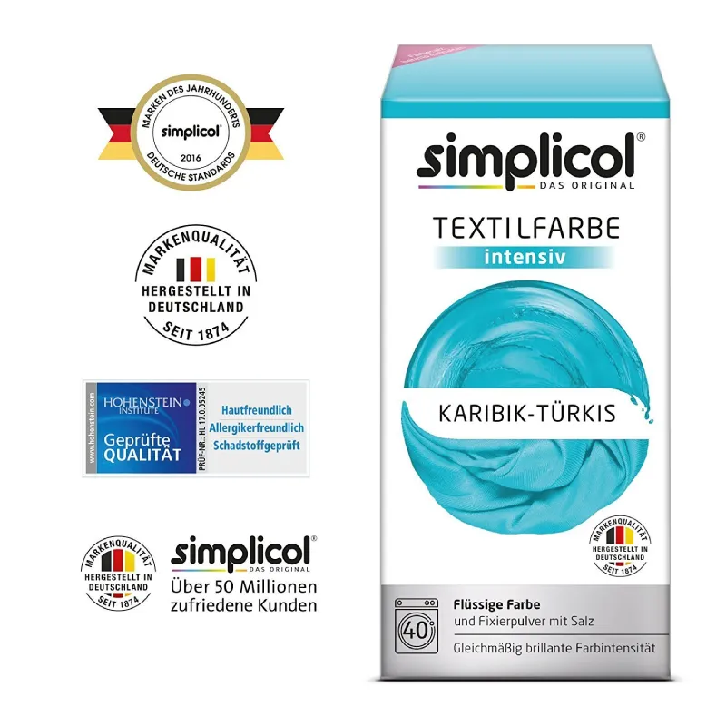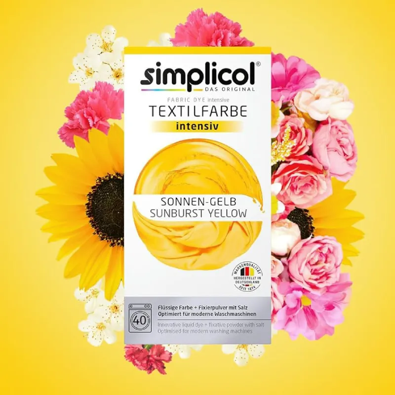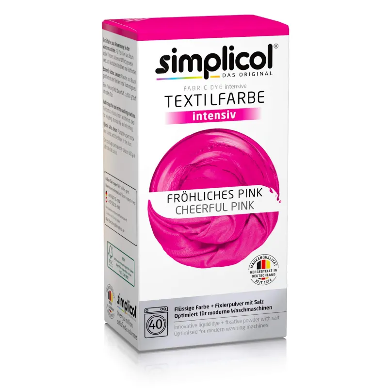 Transformă-ți garderoba cu o singură spălare. Simplicol Intensiv este vopseaua textilă nr. 1 în Germania, oferind o colorare permanentă, uniformă și extrem de intensă. Formula All-in-One conține vopseaua lichidă, fixatorul și sarea, totul într-un singur pachet. Perfectă pentru a schimba culoarea hainelor sau pentru a revigora nuanțele șterse. Sigură pentru mașina de spălat. Alege culoarea preferată și redă viață hainelor tale!